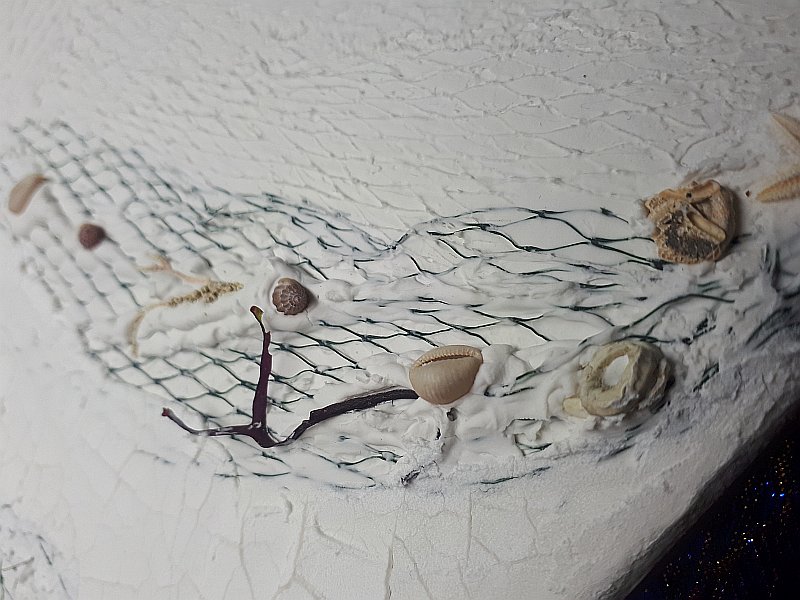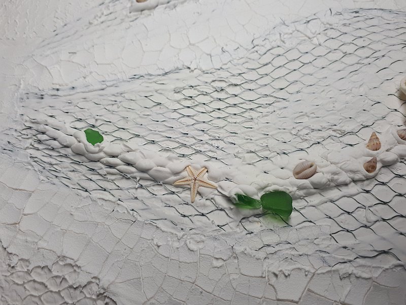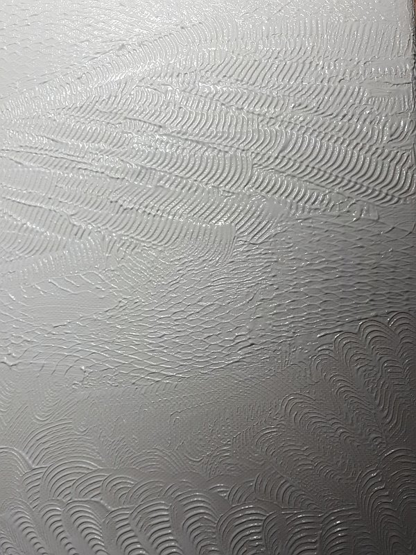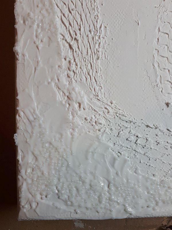 On my long canvas I have applied modelling paste with a small palette knife in varying thicknesses and applied pieces of mesh from fruit bags to create texture. I also applied pieces of the mesh netting so they became embedded in the clay and allowed some to extrude giving wonderful raised textures. There are various weights of the paste too, I used a light one.