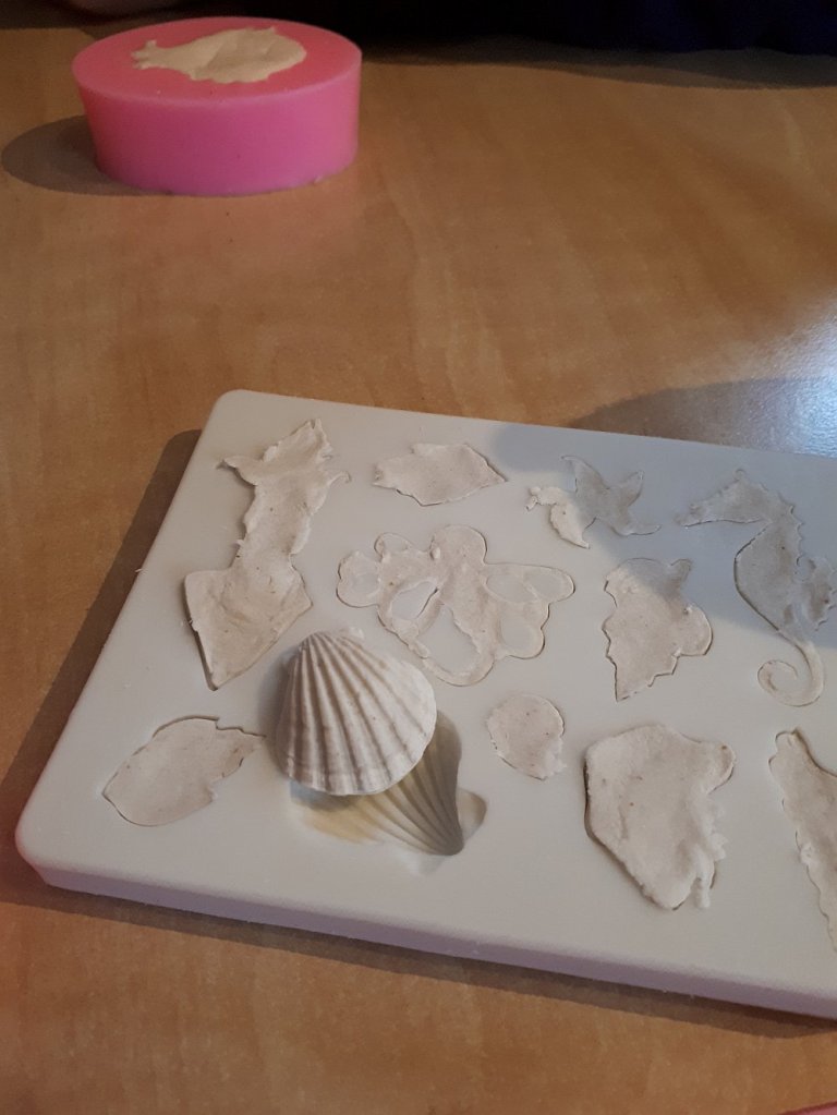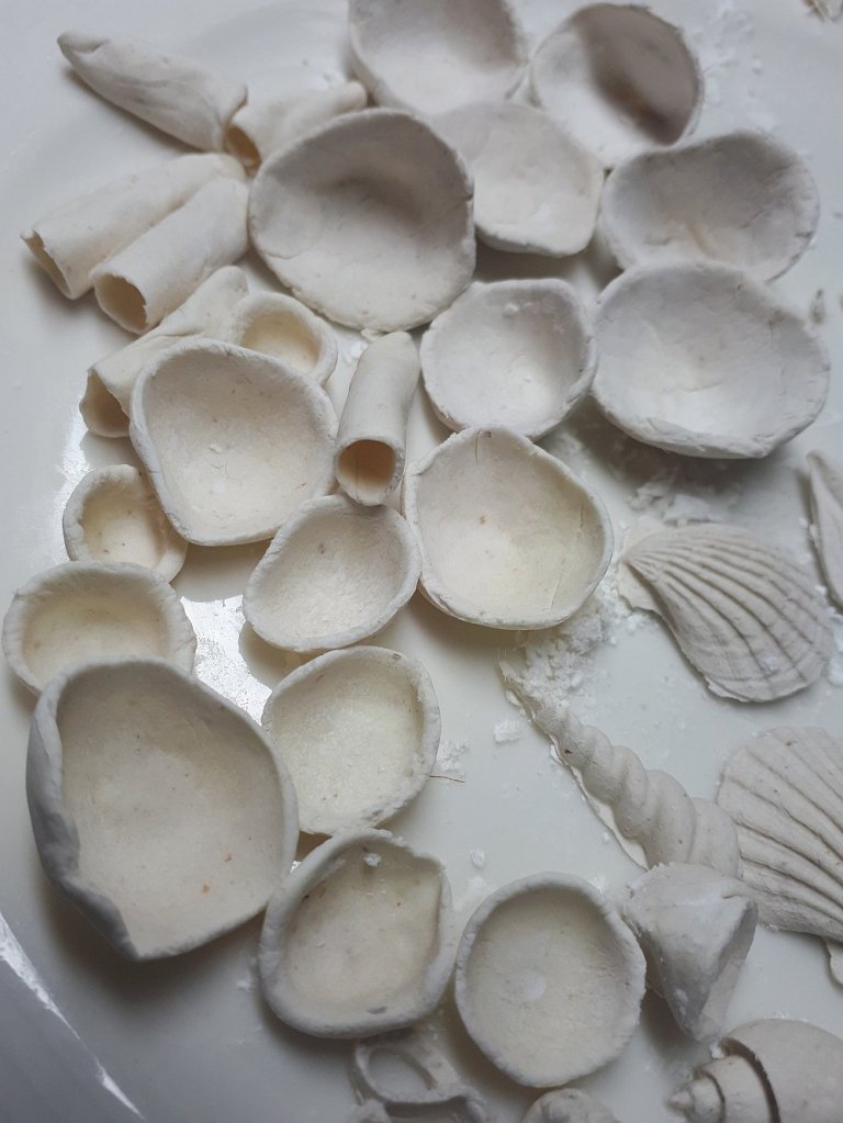 Following my research and experiments into the realm of paper clay, I came across an amazing website with recipes. I was invited to write a guest post with my findings which went online yesterday. So here is the link. It talks about the differences of using ready-made joint filler versus dry powdered, with images of some test pieces. I wanted to learn how to make this type of clay for my latest project idea which combines different sculptural and textured mediums. I used the paper clay to make small hand formed shapes and in a silicone mould to make shells. They are lovely and light, so they won’t add too much weight to the pieces. They dried in a day too as they are nice and thin. The clay recipe does state that it should be applied in thin layers as too much may not dry in the middle and eventually rot. Therefore it is ideal for small features and very small moulds. Next stage is trying out the inks.