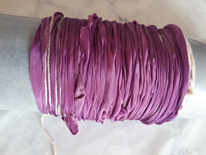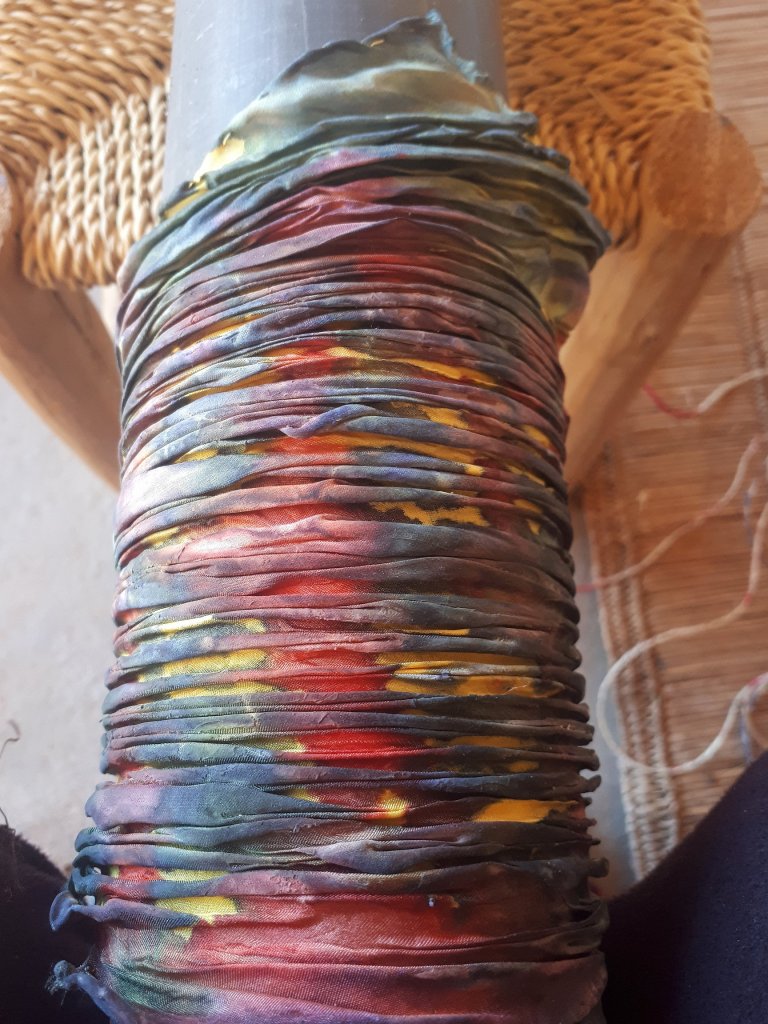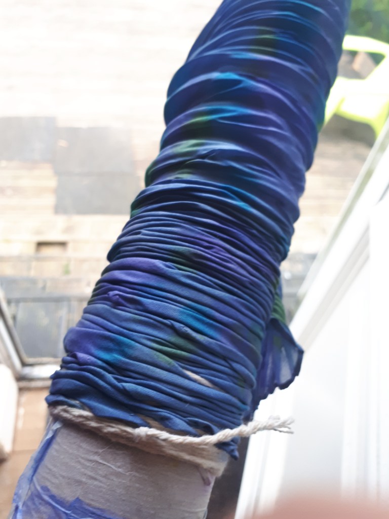 Once the base colour is applied, dried, steamed or not and pressed, it is ready for the pole wrapping stage. A length of PVC pipe is ideal as it is lightweight, waterproof and easy to clean. They come in different diameters, so you can get a few different ones to play around with, the length shouldn’t be less than 60cms, up a meter is better. If you have really long fabric then longer is better. You can use cotton string, sisal or wire, be careful the wire is soft or it may damage the fabric when you scrunch it up along the length of pipe. Cotton string will absorb some of the dye, so maybe try a nylon one for a different outcome. How close together you wrap the string will determine how close together your stripes and also how evenly spaced will make a more random design. It is all about experimenting and having some fun with the pleasure of an unexpected gorgeous outcome. I get really excited when it’s time to unwrap the pole and see the result. You can choose to go a step further then and once steamed, rinsed and pressed, you may wish to rewrap the scarf in the opposite direction to get a completely different design effect.