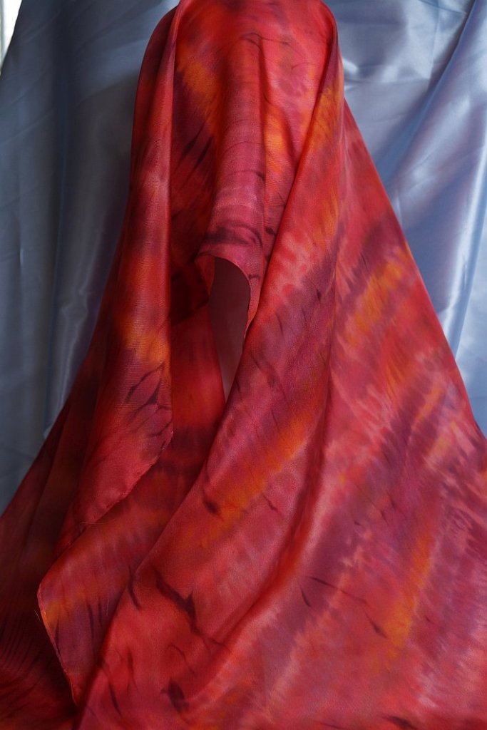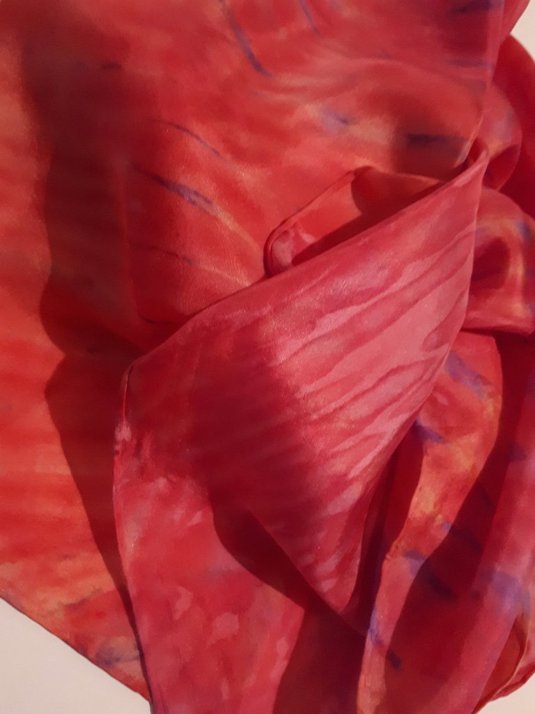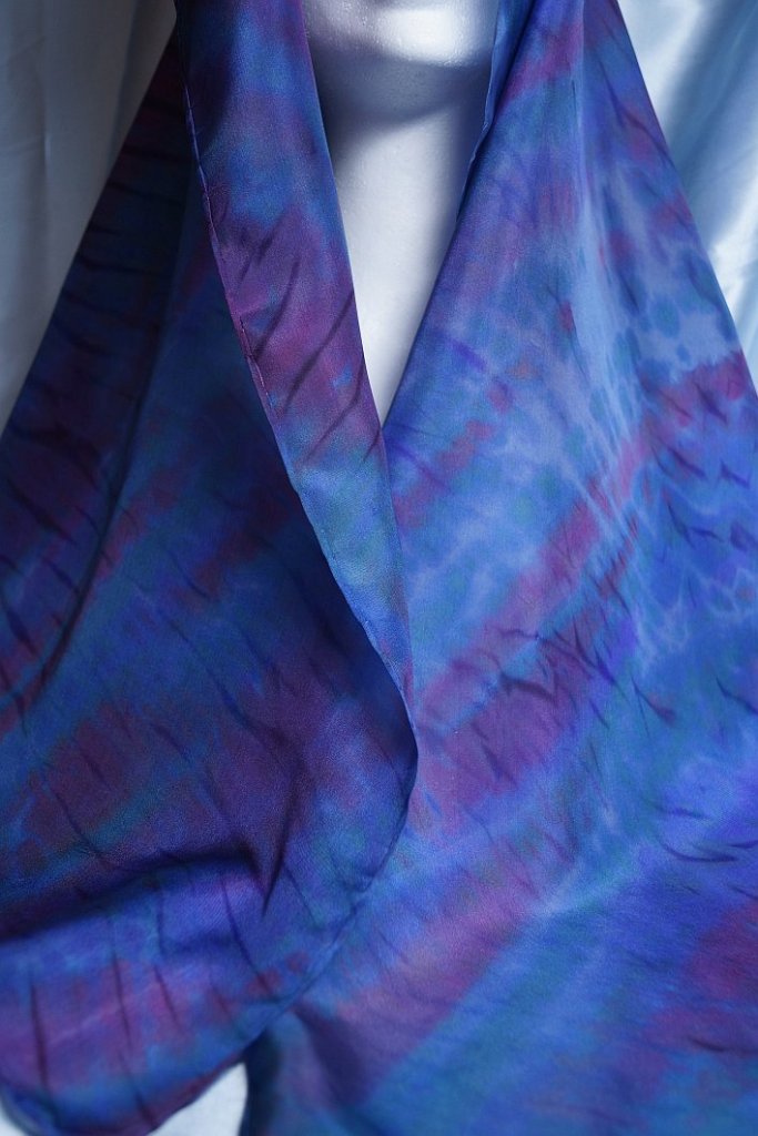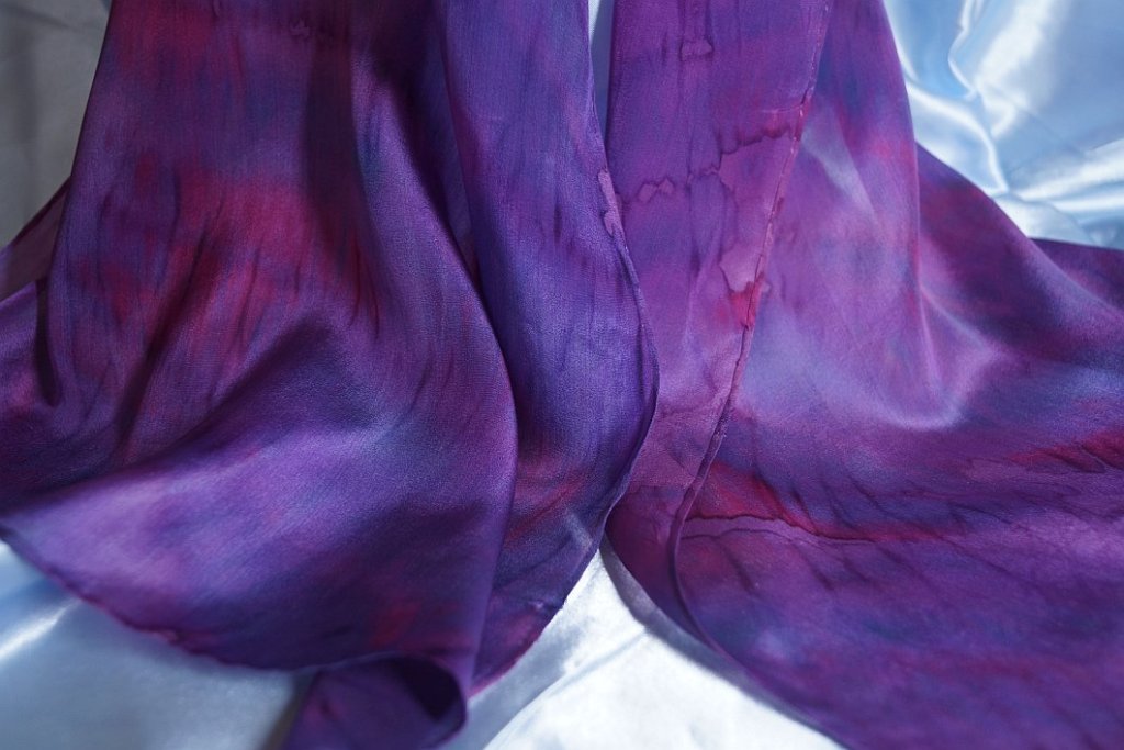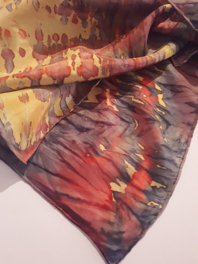 You can use a plain white scarf if you wish and I will do that next time. Usually, I dip dye each scarf with a base colour, some will be steam fixed and some not. The ones that are steam fixed will keep patches of their colour where new dyes do not reach, the unsteamed ones will blend with the newly applied colours.
