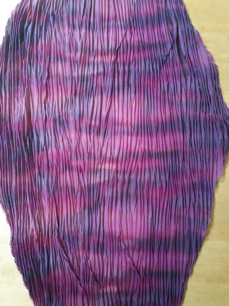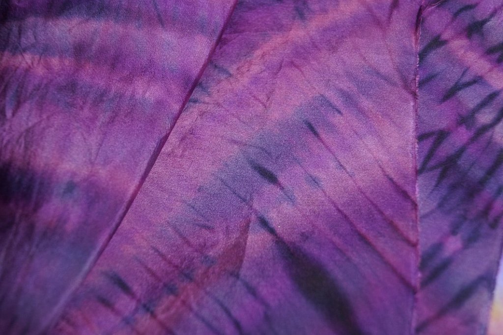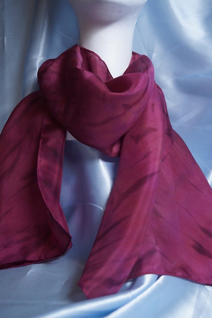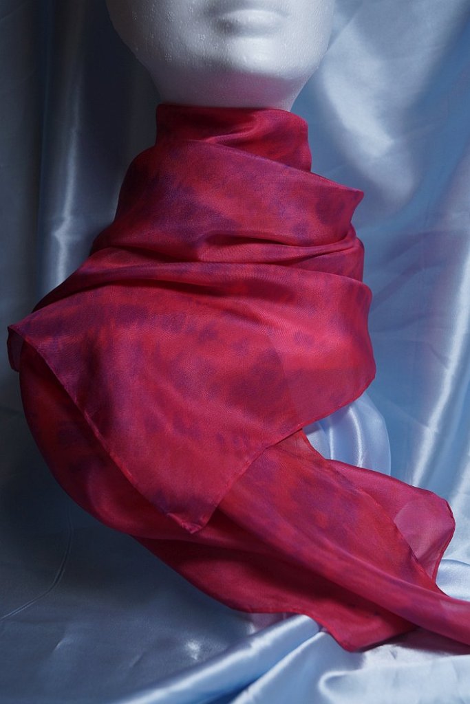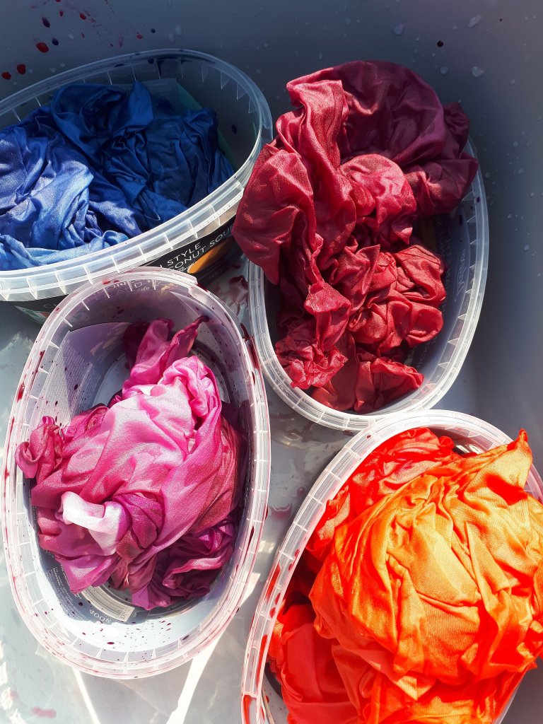 You can use a plain white scarf if you wish and I will do that next time. Usually, I dip dye each scarf with a base colour, some will be steam fixed and some not. The ones that are steam fixed will keep patches of their colour where new dyes do not reach, the unsteamed ones will blend with the newly applied colours.