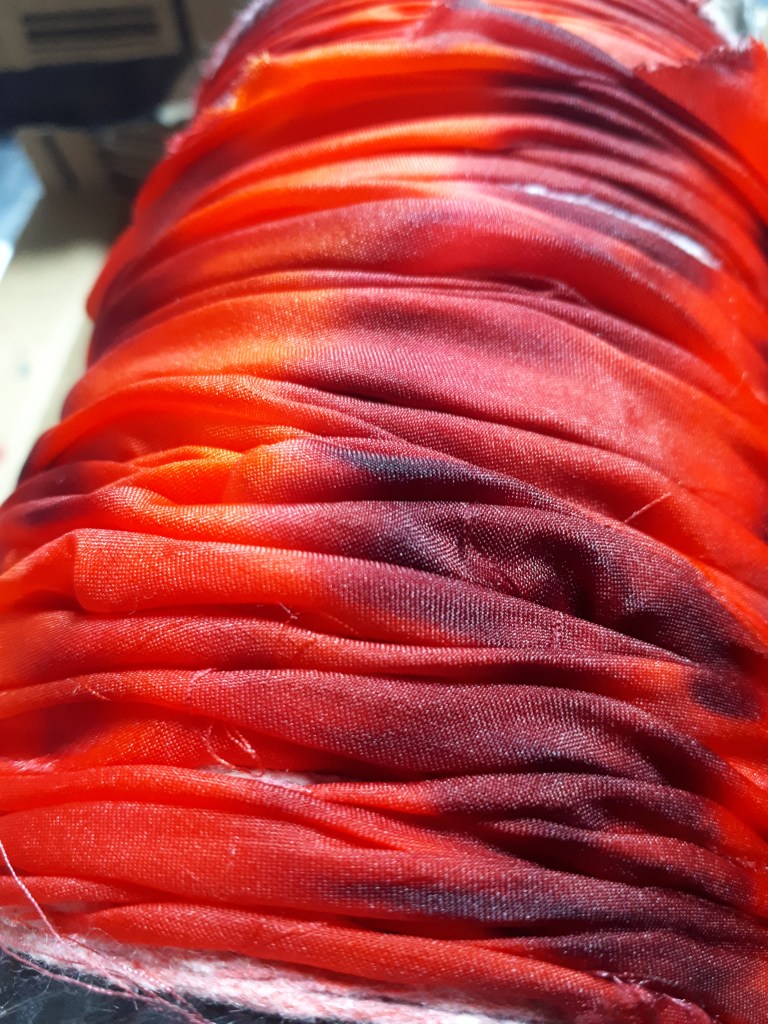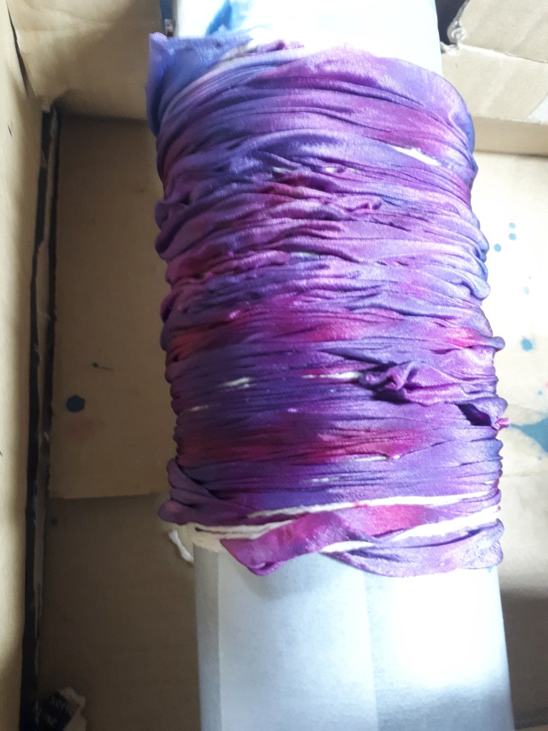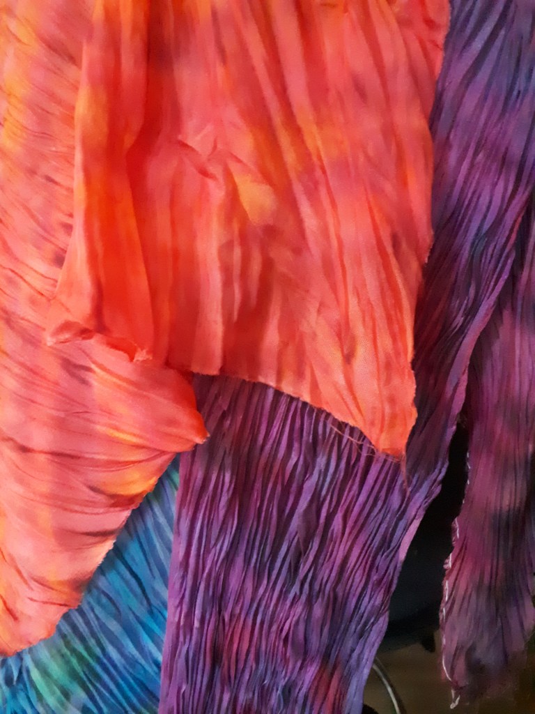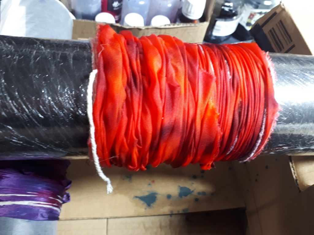 Shibori dates back to the 8th century in Japan where traditionally indigo was used to dye fabrics. There are different forms which with folding, stitching, compressing, binding and twisting the fabrics, form an array of designs and unique patterns. I adore working with silk and have been making hand painted scarves for many years. I like to explore new ways of applying dyes and came across the Arashi Shibori technique a few years ago. Arashi means storm and the patterns formed using this pole wrapped method create designs like driving rain. It is at its best when used on long pieces of cloth. Since the late 19th century, Japanese artisans working 2 together, could wrap up to four 12 yard kimonos on 12 foot poles saving a lot of work on older methods and techniques. This is perfect for silk scarves. Once I had got the gist of the process I played around with it, twisting and folding the fabric as I wrapped it, this created amazing feather like patterns. I try to keep to no more than four colours which in turn when blended will form other colours, these must be thought about too so they are all compatible.