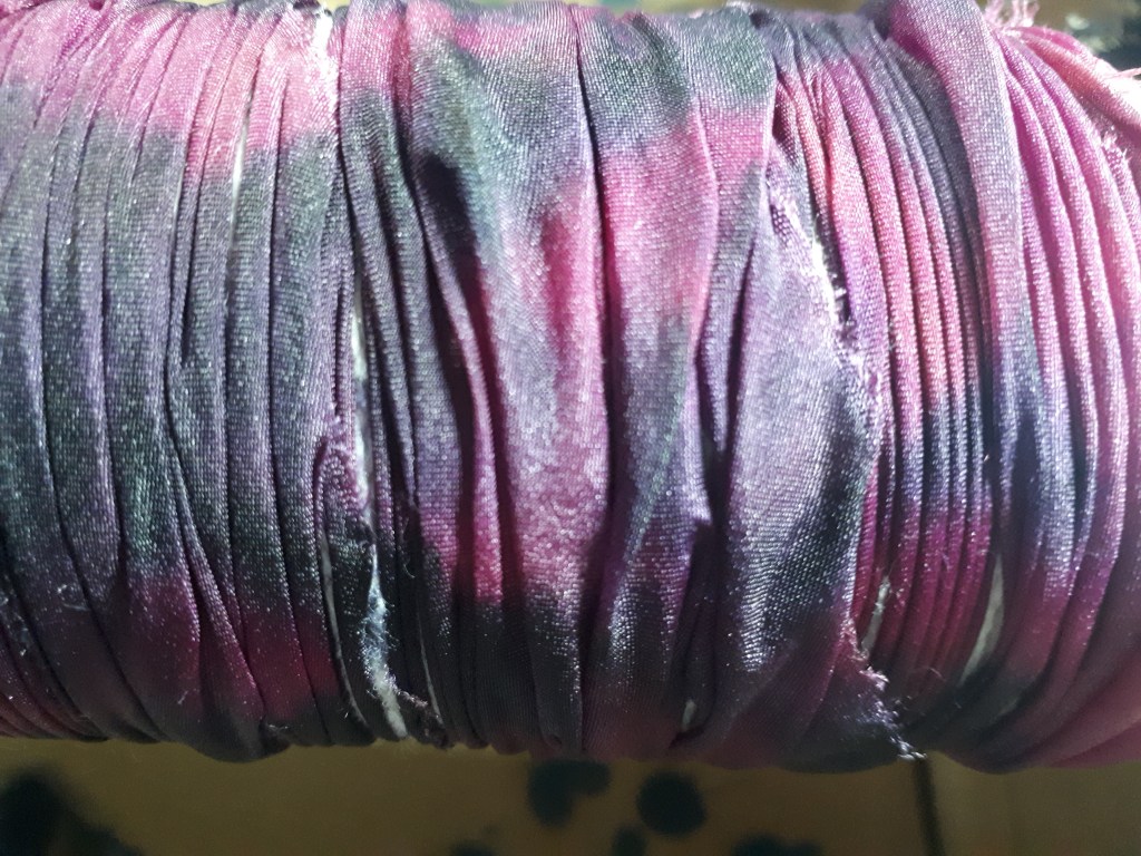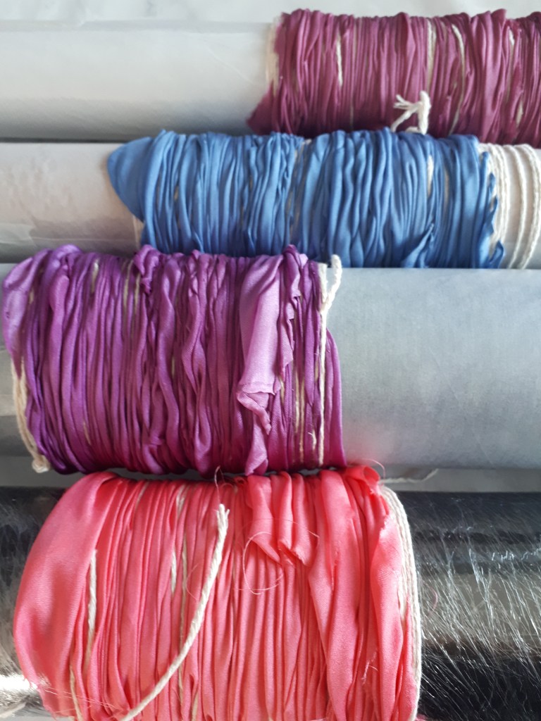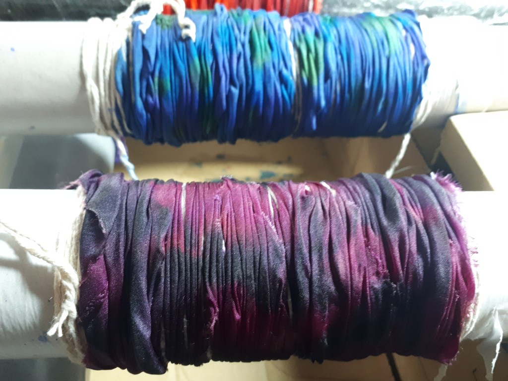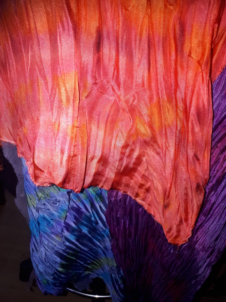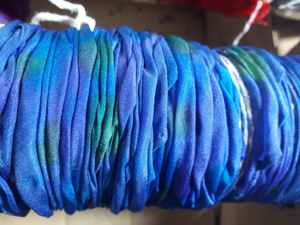 Shibori dates back to the 8th century in Japan where traditionally indigo was used to dye fabrics. There are different forms which with folding, stitching, compressing, binding and twisting the fabrics, form an array of designs and unique patterns. I adore working with silk and have been making hand painted scarves for many years. I like to explore new ways of applying dyes and came across the Arashi Shibori technique a few years ago. Arashi means storm and the patterns formed using this pole wrapped method create designs like driving rain. It is at its best when used on long pieces of cloth. Since the late 19th century, Japanese artisans working 2 together, could wrap up to four 12 yard kimonos on 12 foot poles saving a lot of work on older methods and techniques. This is perfect for silk scarves. Once I had got the gist of the process I played around with it, twisting and folding the fabric as I wrapped it, this created amazing feather like patterns. I try to keep to no more than four colours which in turn when blended will form other colours, these must be thought about too so they are all compatible.