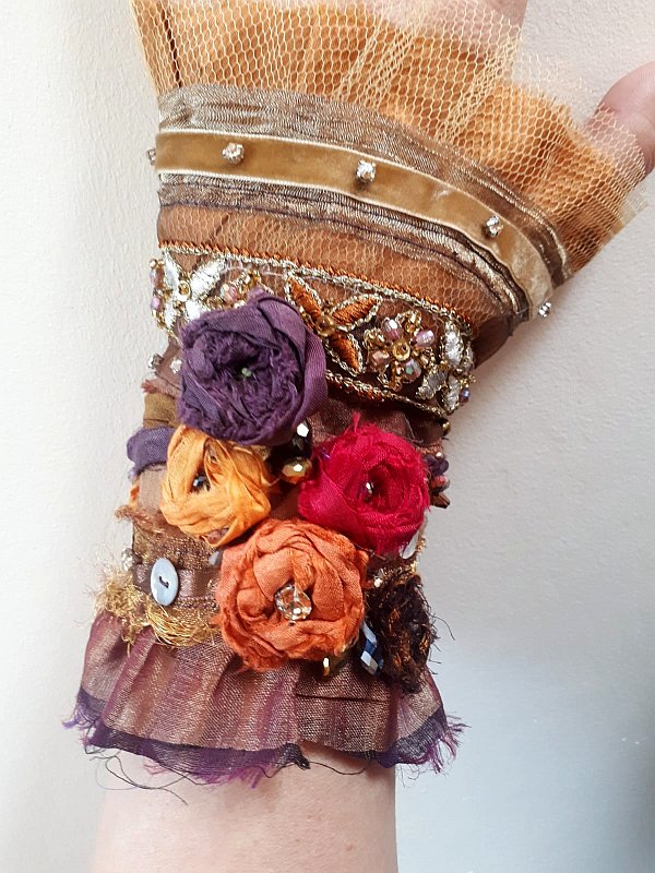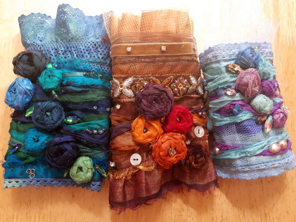 My love of all things silk led me to buy a gorgeous pile of silk sari ribbons and with all the elements finally in one place, I have been sewing these pretty shabby chic wrist cuffs. I think they are just so feminine and romantic. A bracelet with a big attitude. I guess they are related to my textile wall hanging , taken to another level with hand dyed pieces of lace and trimmings, beads and embellishments.