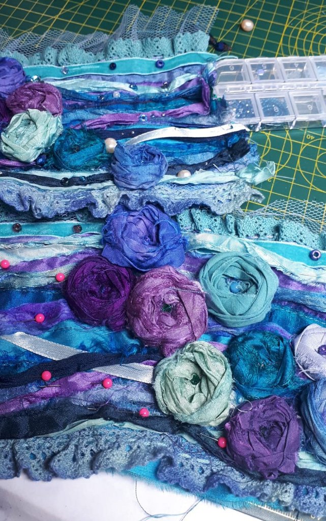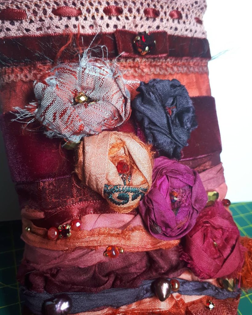 I have been dying cotton lace and velvet ribbons as well as bits of silk to use on these textile pieces and I am considering make bundles to sell perhaps in the popup shop we are hoping to have in my son’s restaurant when things open up again here. I will see if they are popular and I may add them to the website. I found it impossible to source natural beautiful colours in the trimmings I wanted to use so I am sure there are others out there who would love my dyed pieces.