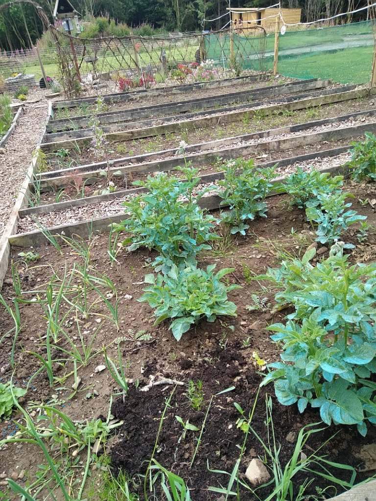 Potatoes and onions set. The weather here has been unseasonably cold and wet so everything was late getting going, in my favour really considering we were a month late starting off. I had to relearn how to garden in northern Europe and have been frustrated at how slow everything is to germinate and get going. Coriander in particular would have been seed to table in a few weeks in Morocco, here a few months!