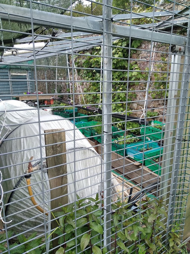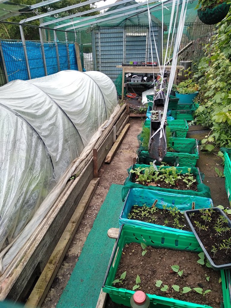The old greenhouse was cleared out and all the broken glass removed. No glass meant it was open to the coastal winds that blow straight in off the Atlantic. I made a makeshift polytunnel inside with black piping and plastic, covered the front with tarpaulins and she was good to go. Old crates from food deliveries make for excellent seed trays. Seeds were ordered and once arrived we set to planting and deciding what would go where.