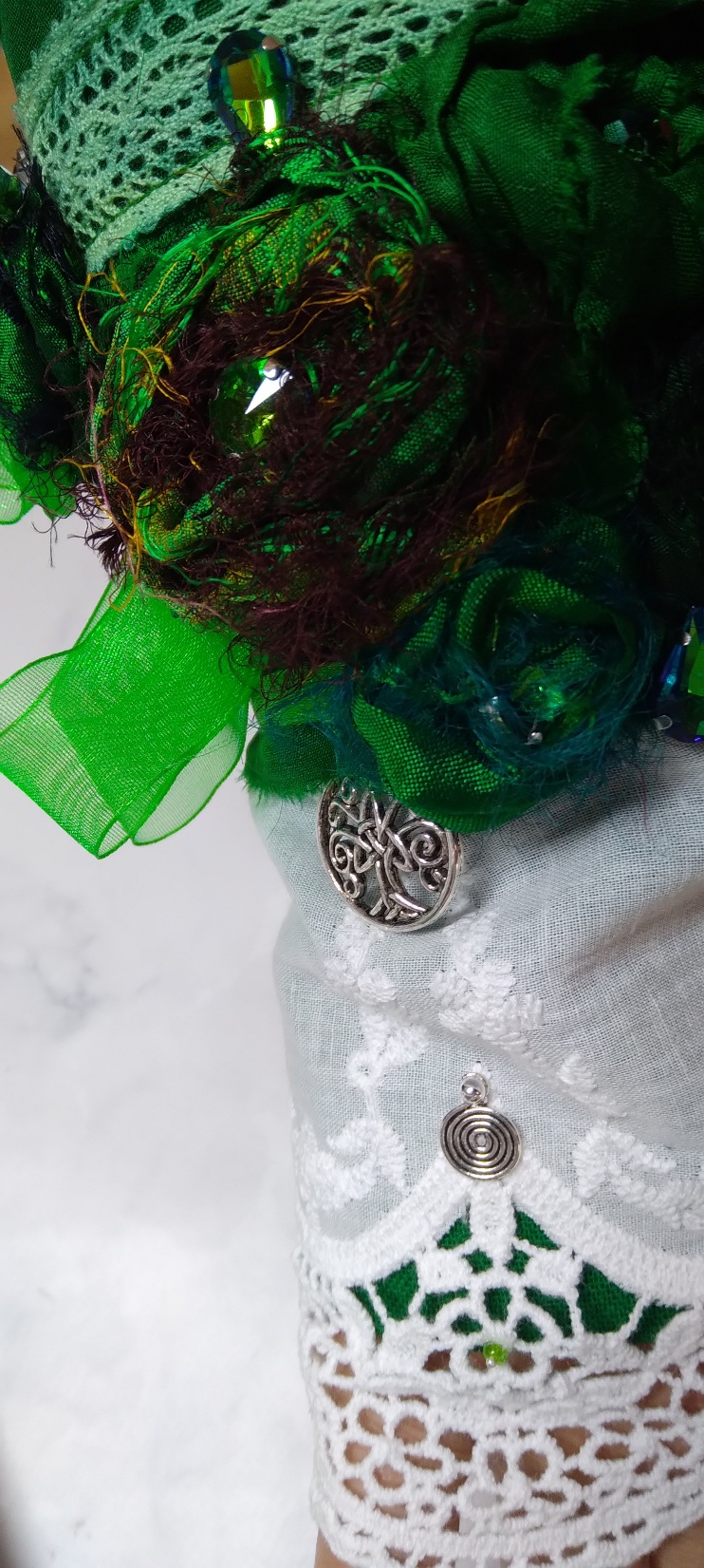 The white piece of lace has an edge not too dissimilar to traditional Irish crochet… a very intricate form of lace which I have made in the past. Therefore together these elements form the Irish connection.