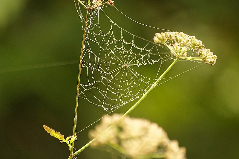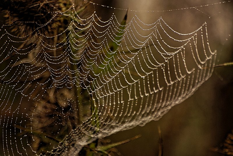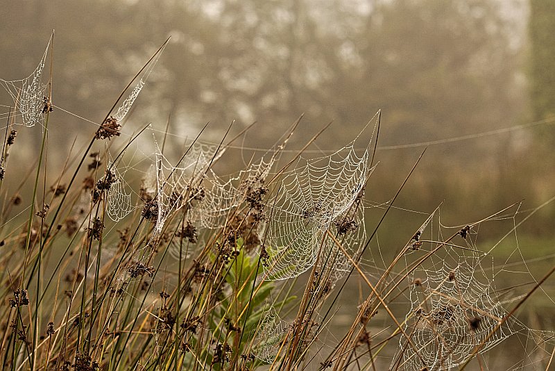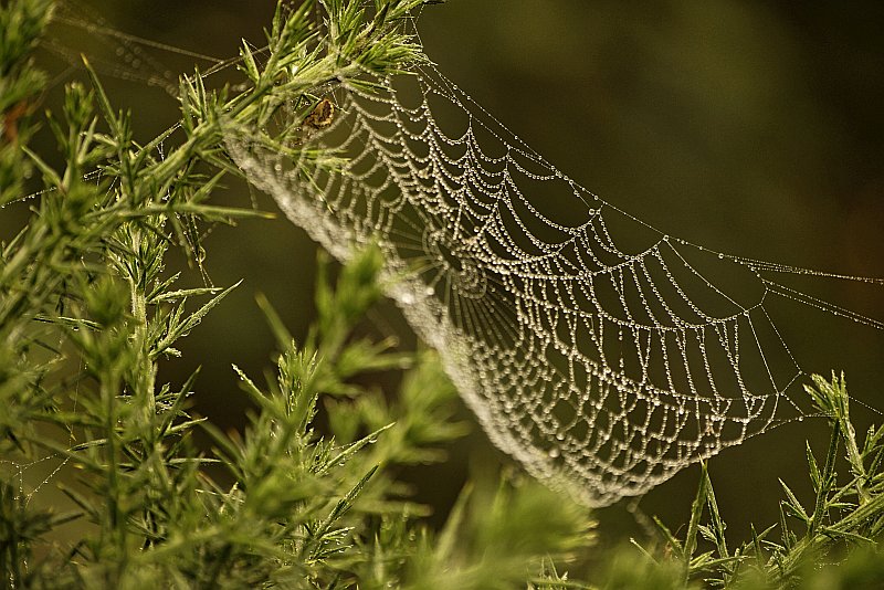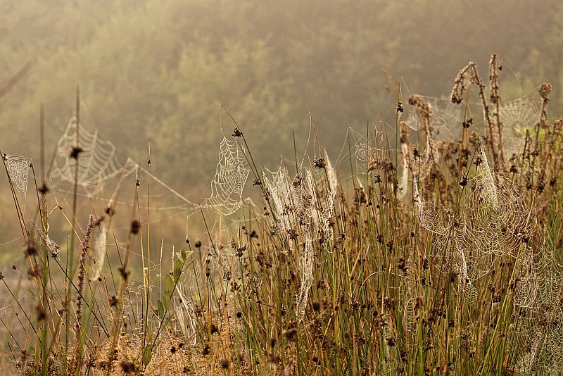 Today is one of those truly magical times after a night of thunder and heavy rain, when the fog is thick, the air is humid and the fairy folk are only just beyond our scope of vision. My 2 year old grandson accompanied me on my morning wander with my camera and said “hello” to many of the little people. It is rare to see so many dew dropped bedecked spider webs as I did today, I was completely in awe of the spectacle. Even the tallest pines were strewn from bottom to top.