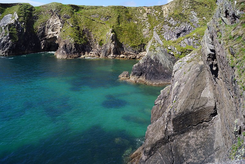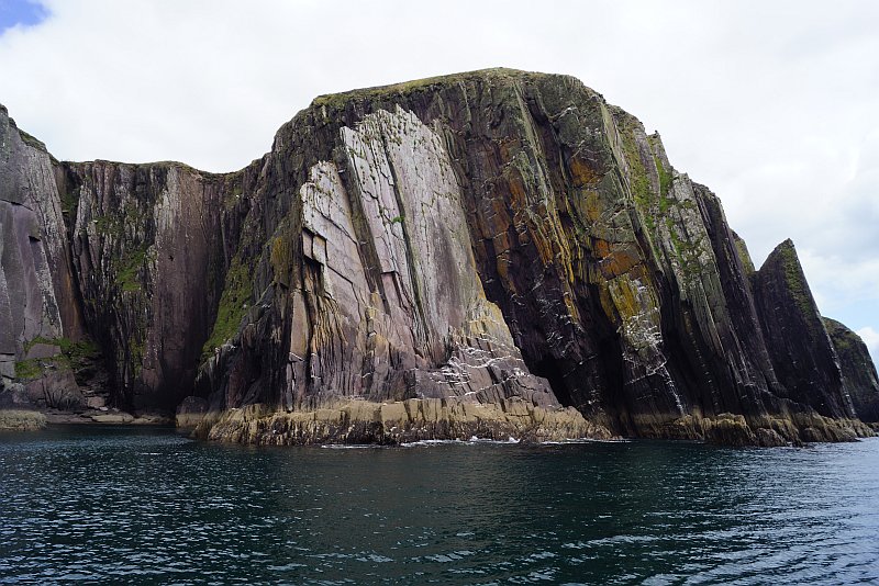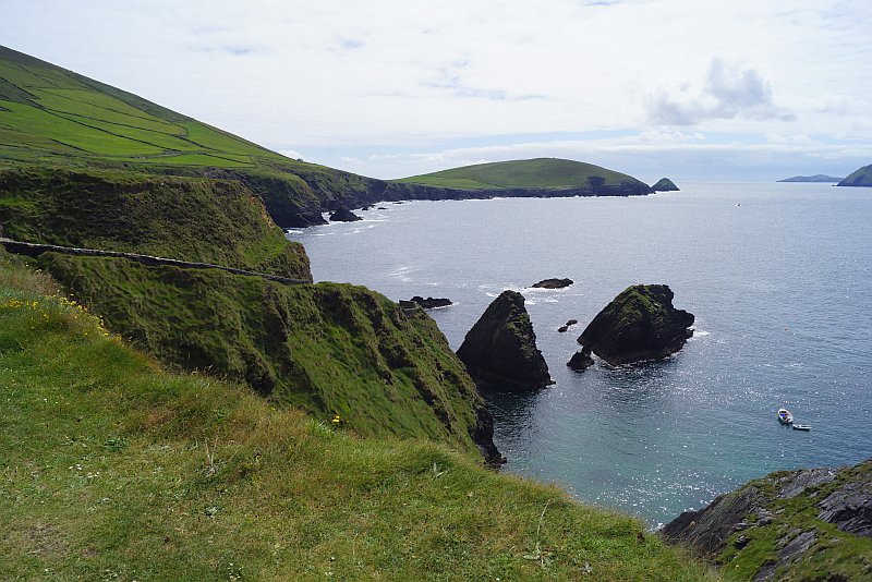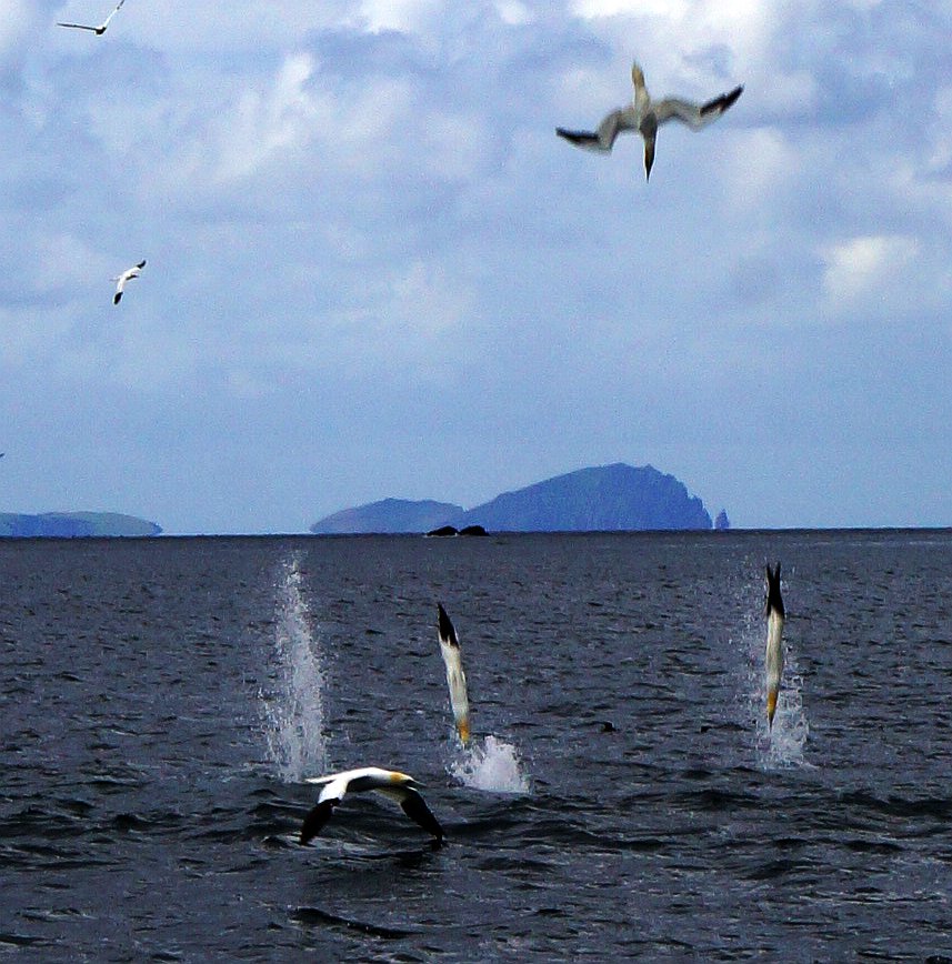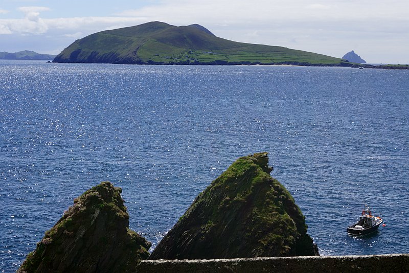 The following day we took a short boat trip to view the land from a different perspective and were treated to an ariel show by the local gannets. Apparently they hit the water at 70 miles per hour and concord was designed from their likeness. Quite incredible to see them plummet, folding their wings as they descend, to form a long thin torpedo just before they hit the water, dive down, collect their meal and back up. Guillemots bobbed about in their solitary lives. No dolphins today though. We were told the story of Fungi the dolphin: very famous in these parts and how he ensnared his daily catch. He hasn’t been seen the last 18 months so either the fish are not around anymore or he has passed on, everyone assumes the latter as he was always visible around tourist boats. Dingle was a hugely important harbour and played significant roles in smuggling and trade.