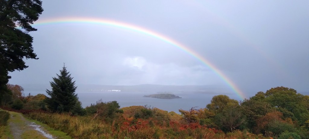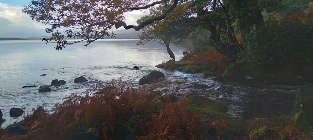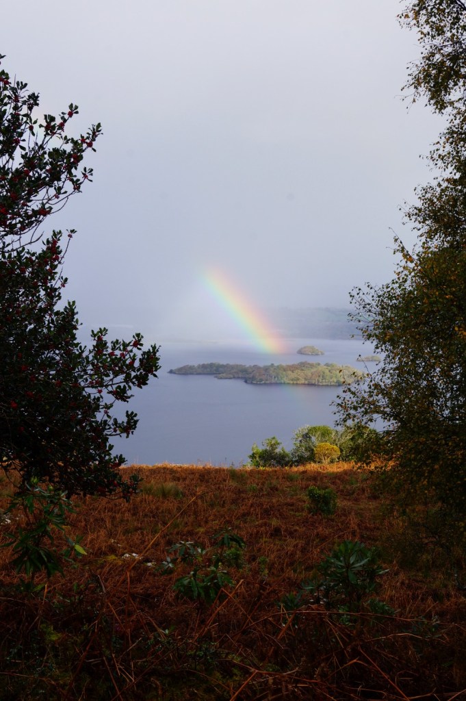 My absolute favourite place on the island of Ireland is Killarney and this week I spent a few days wandering in a few of its ancient magical places. Tomies Wood is one of those places. I knew the weather was not going to be the best and went well prepared. The upside of rain showers and bursts of sunshine are rainbows and I was right up at the highest part of the trail looking down on Lough Leane to witness a few beauties. Mostly they were only partial ones as the showers moved across the lake casting fingers of light on the islands below. Magical. The rainbow at one point fell upon the island of Innisfallen, The Annals of Innisfallen, recording Ireland’s ancient history, were written there in the 11th century, however the monastery was burned by Cromwellians in 1652.