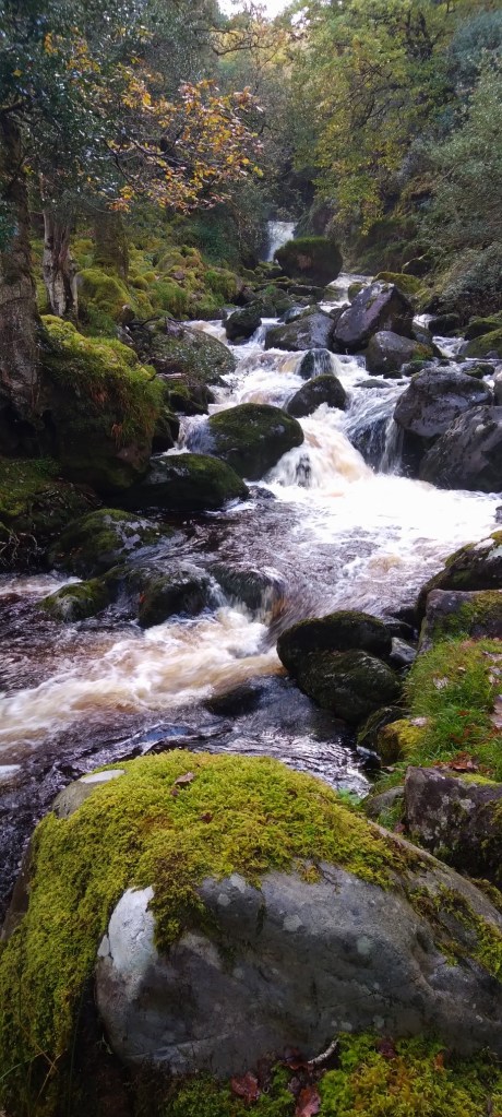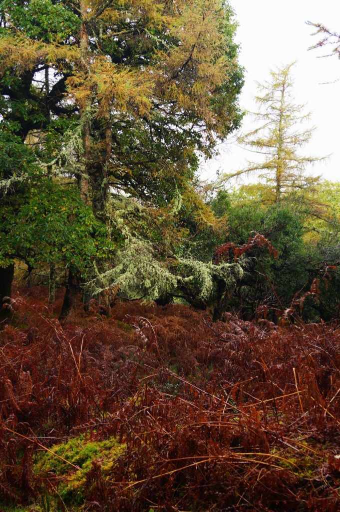 This woodland is predominantly holly, oak and larch which meant those gorgeous autumnal leaves and colours with bursts of dark green and bright red berries were all around me. A great place for the Sika deer to wander too, I was aware of their presence with soft calls and whistling falling on my ears and the not so quiet movements as twigs broke. A fair sized stag was watching me at one point which was a small bit unnerving but I am sure he was more interested in his ladies than what I was doing. There are two Killarney herds of Sika and Red Deer numbering about 800 which have ranged hereabouts since the last Ice Age. October is rutting season and I saw them down in the park two days ago. The Sika are quieter than the Red deer so I wasn’t too alarmed.