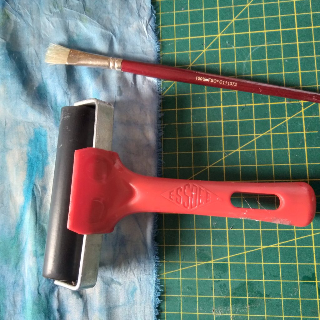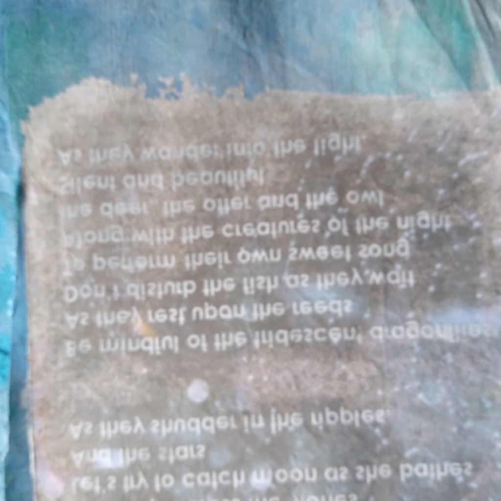 So the process was very simple. Firstly, on your laptop or device, decide on an image or text you wish to apply to your fabric. Double check your spelling is correct and then horizontally flip your image/ text before saving it. Print it out on normal 70 to 80 grams printing paper…. do not use photographic paper. Make sure the fabric is clean, dry and pressed. Decide where you want your image to appear. At this point, you may want to tear the edges of your image to be less defined looking. Lay your fabric and your print on a piece of wipeable plastic or other surface as the Modge Podge is a bit messy and hard to remove. On the image side up, apply a layer of Modge Podge with a brush. Carefully lay it on the fabric, white side of the paper facing you. With a brayer, smooth it down being careful with any solution that may seep out. Leave to dry up to 24hrs. Using a soft sponge with cold water squeezed out, damped the surface of the paper and gently start rubbing the excess paper off to reveal your text. I turned mine over, covered it with a cotton cloth and pressed it with an iron in a silk setting until it was dry again. Wash your brayer and brush immediately in warm soapy water.