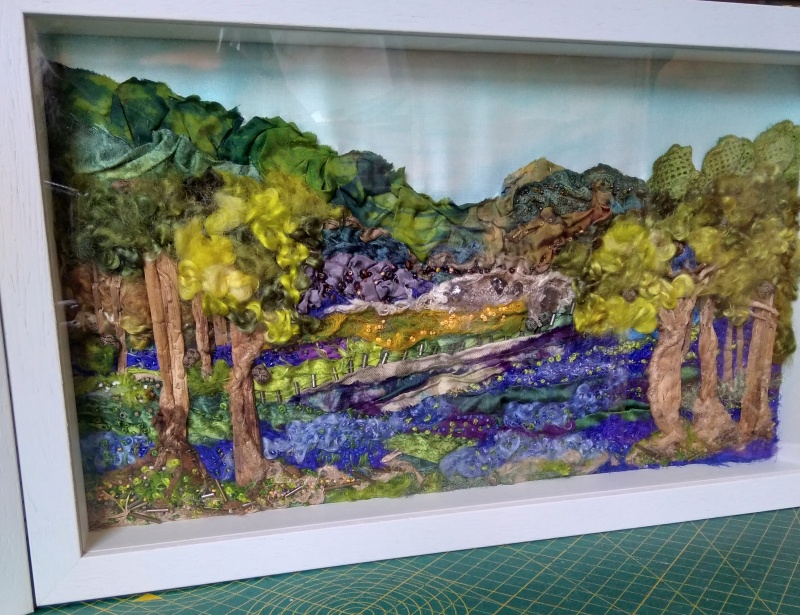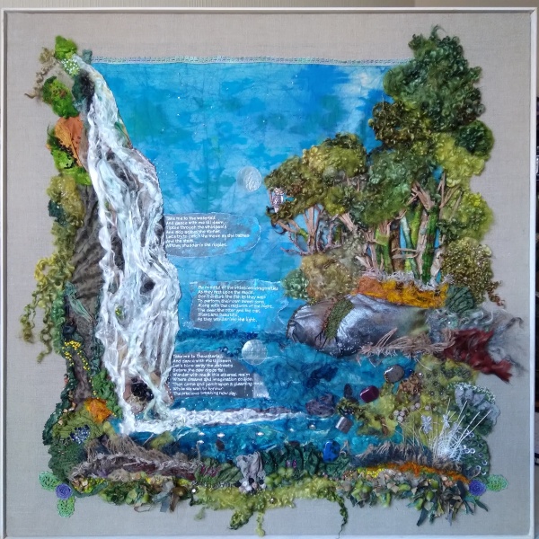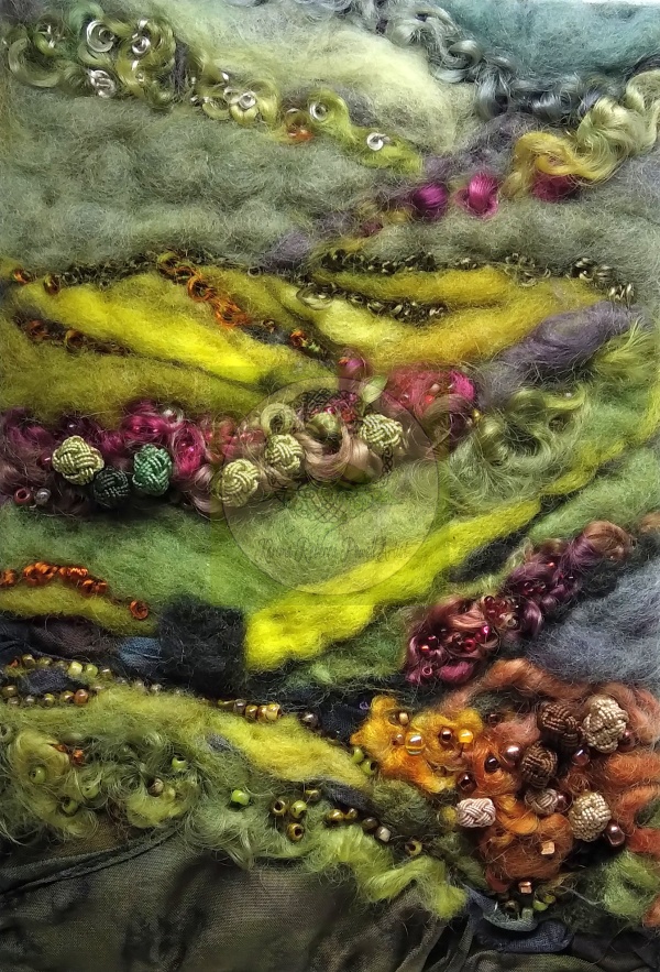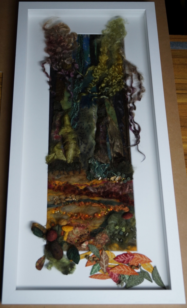 Hand dyed silk fabrics, lace and Irish wool, hand dyed, carded and spun wool, recycled silk sari ribbons, silk and plant fibres, eco printed linen and beads. Hand stitched. Framed.