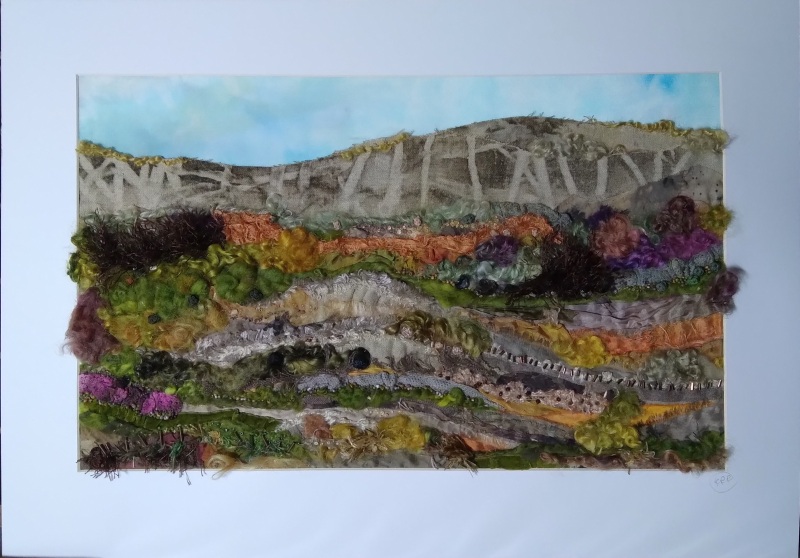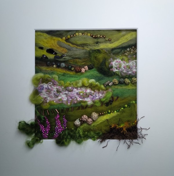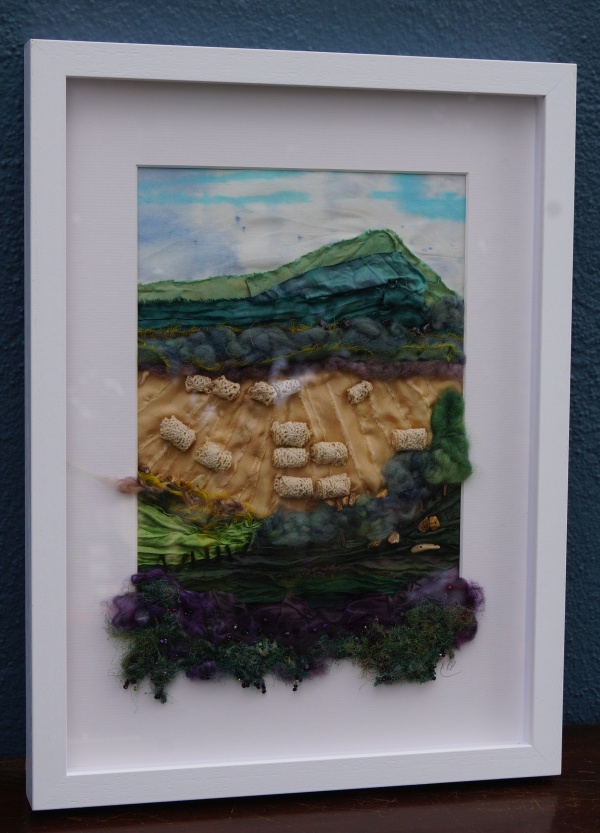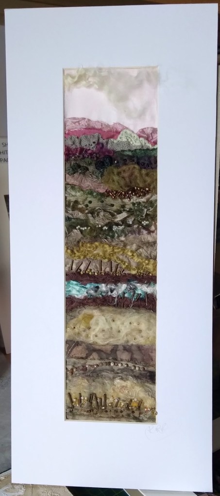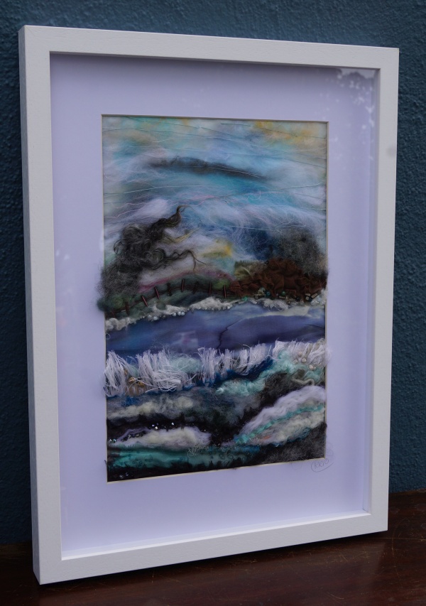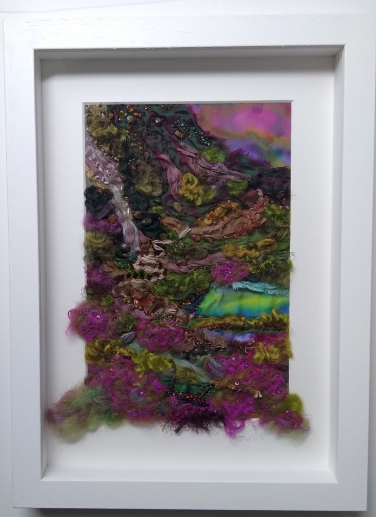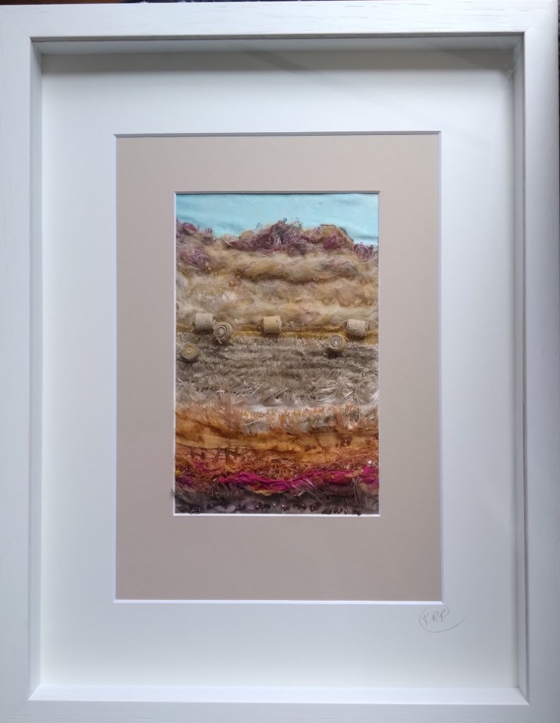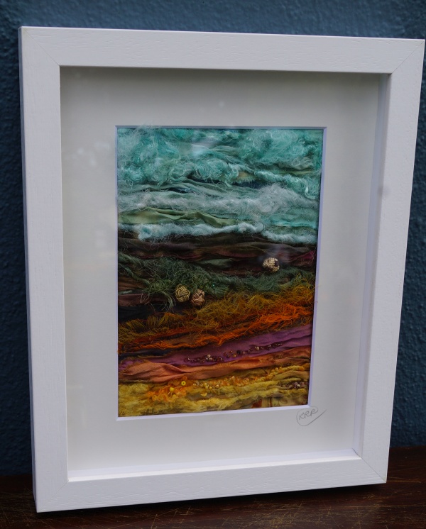 Hand dyed silk fabrics and Irish wool, hand dyed, carded and spun wool, recycled silk sari ribbons, silk fibres, eco printed and dyed linen, wool fibres and beads. Hand stitched. Framed.