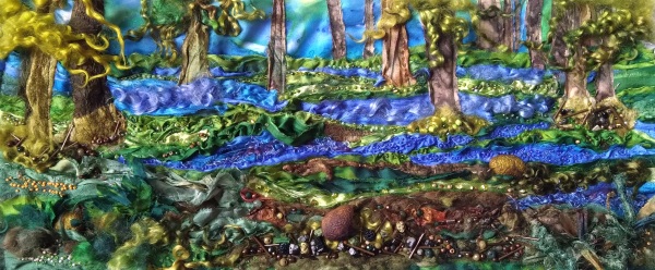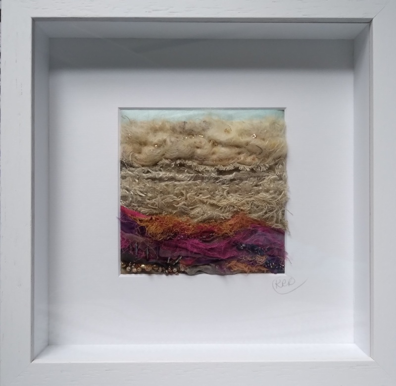 Hand dyed silk fabrics, hand carded wool with silk fibres, recycled silk sari ribbons, silk fibres, eco dyed linen and beads. Hand stitched. Framed.