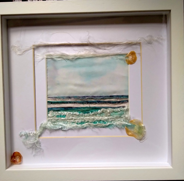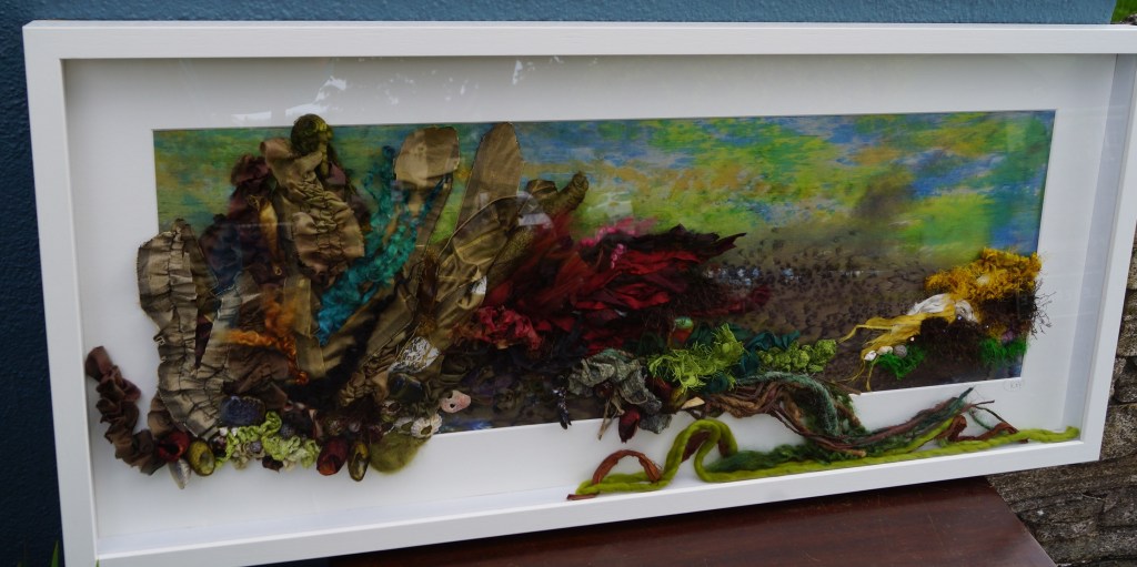 Hand dyed silk fabric, recycled sari silk ribbons, banana yarn, silk roving and beads. Locally foraged shells. Hand stitched. Framed.