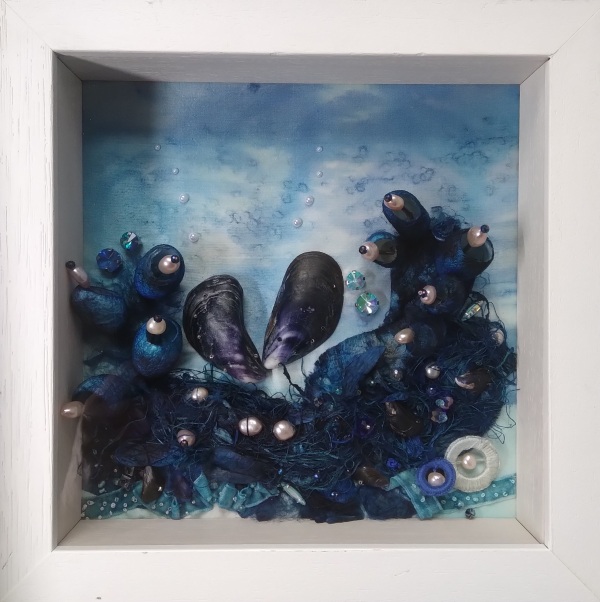 Hand dyed silks, tulle, tissue paper, text, silk, recycled silk sari ribbons, embroidery, recycled jewellery, beads, gemstone chips, rhinestones, banana silk yarn and shells, metal charms, silk cocoons, fresh water pearls, wood beads, dyed lace, sea glass and mermaids purse. Hand stitched. Framed. Silk Purse comes with it.