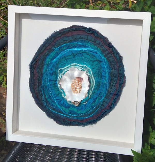 Recycled silk sari ribbons, dyed banana yarn, beads, oyster shell drill and stitched in place, fresh water pearls, starfish. Framed.