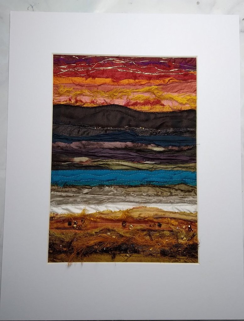 Recycled sari silk ribbons, linen, organza. Machine stitched. Mounted/Matted.