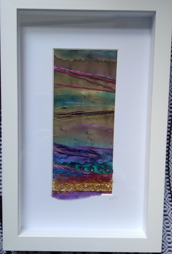 Hand dyed silk and silk fibres, beads and threads. Hand and machine stitched. FRAMED