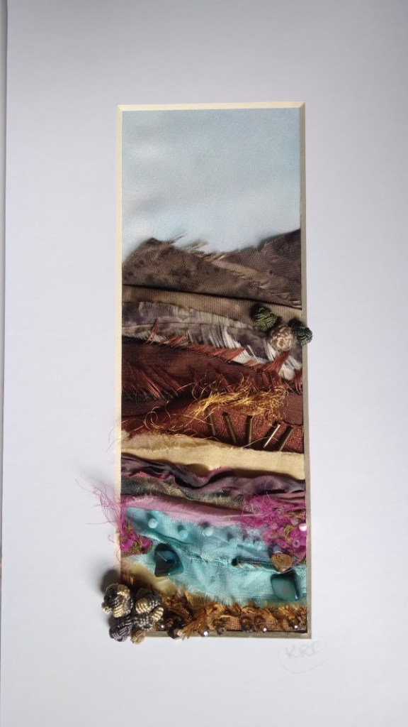 Hand dyed silk fabrics, hand carded wool with silk fibres, recycled silk sari ribbons, silk fibres, linen, gemstone chips and beads. Hand stitched. Framed.
