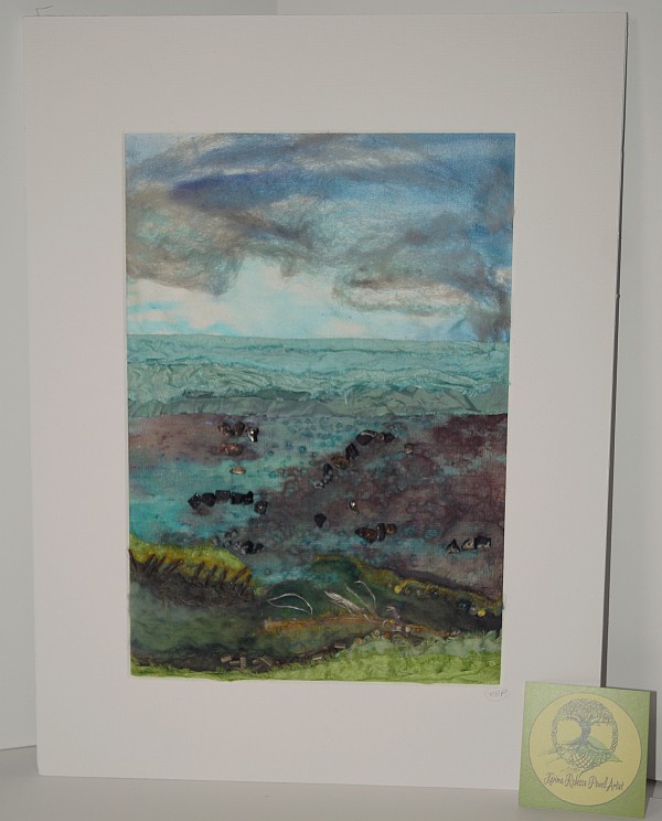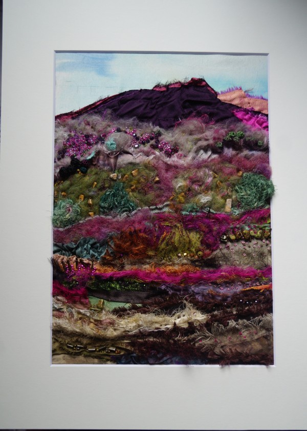 Hand dyed silks and Irish wool, recycled silk sari ribbons, linen, wool and beads. Hand stitched. Hand crafted mount. Framed.