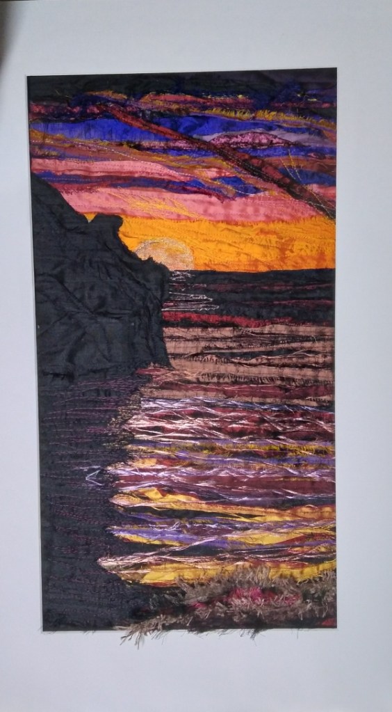 Hand dyed silks, recycled silk sari ribbons, beads, sabra silk and gilt threads. Machine stitched. Framed.