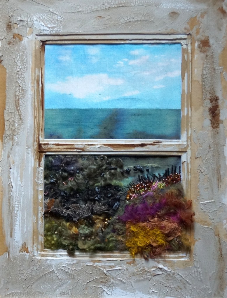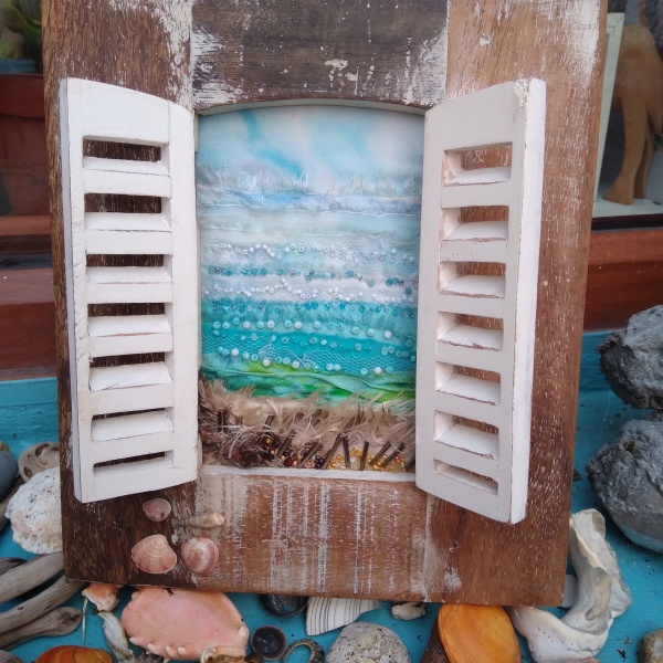 Hand dyed silk fabric and lace, banana yarn, embroidery and beads. Locally foraged shells. Hand stitched. Framed.